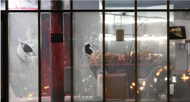 Figure 3: Evidence of vandalism TTPs from a February 2025 Palestine Action attack against an Allianz insurance office in Milton Keynes, UK (Source: Palestine Action)