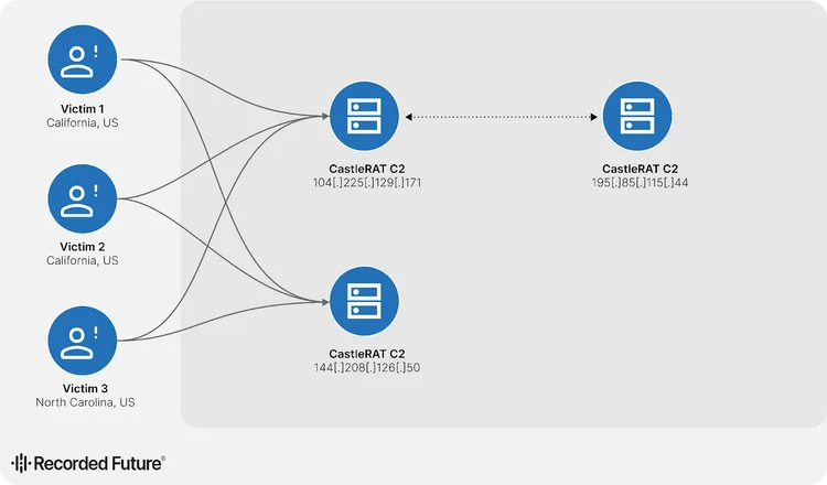 Analysis of CastleRAT C-variant command-and-control (C2) infrastructure reveals notable operational overlap across multiple nodes sharing the RC4 key “NanuchkaUpyachka.” As illustrated in Figure 3, Insikt Group observed two CastleRAT C2 servers, 104[.]225[.]129[.]171 and 144[.]208[.]126[.]50, maintain concurrent communications with at least three US-based victims, suggesting coordinated or redundant control channels. The overlapping traffic patterns, observed within the same daily collection windows, indicate that compromised hosts reached out to multiple C2s nearly simultaneously rather than migrating between them over time. This behavior implies a deliberate redundancy strategy employed by the threat actor. Additionally, direct communications between two CastleRAT C variants, 104[.]225[.]129[.]171 and 195[.]85[.]115[.]44, further point to an interconnected infrastructure ecosystem rather than isolated C2 instances. Such internal connectivity could facilitate automated data synchronization, lateral control distribution, or key exchange mechanisms within the threat actor’s tooling, underscoring a more mature coordinated operational model than previously documented.